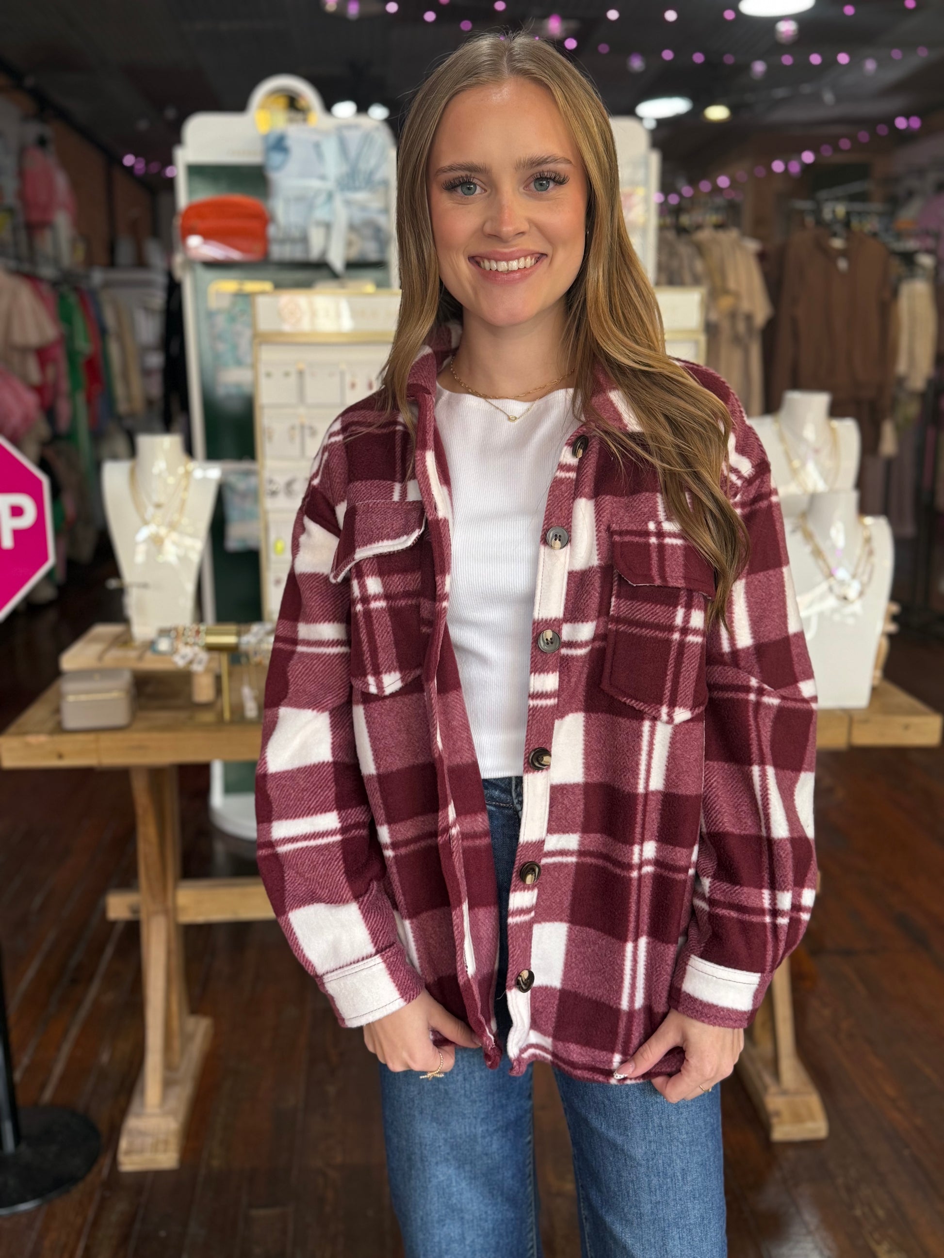 Check Printed Shacket in Burgundy